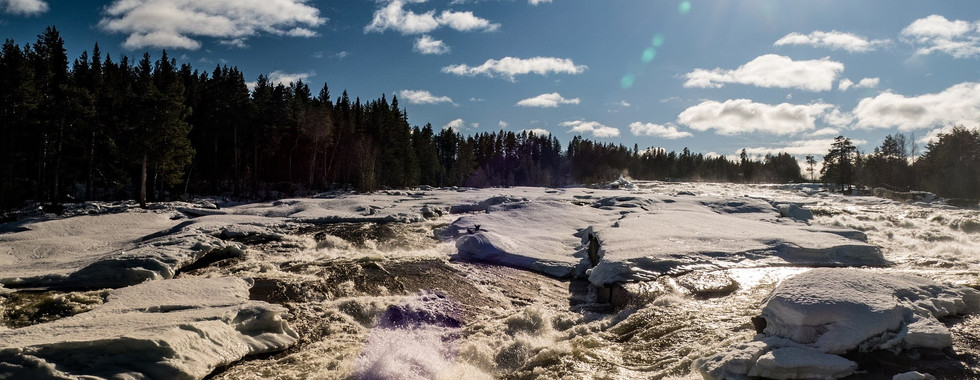 Děláme ještě krátkou zastávku u vodopádů Storforsen, které jsou napůl zamrzlé a opravdu krásné. Cesta k nim vede přes dřevěný most, který je kvůli ledu zavřený, ale to nás nezastaví. Jinak mi ta cesta trochu splývá. Všude jaro a pak najednou sníh i na silnici a pekelná kosa. A najedenou cedule Polarcirkeln.