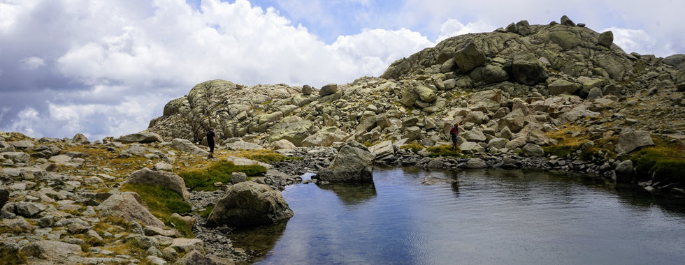 Nejpohodovější túra na GR20, kterou jdeme. Žádné náročné výstupy, dlouhý mírný sestup... prostě pohoda. Pro změnu jsme ráno začínali z kopce, takže jsme toužebně koukali na ustupující stín abychom se na sluníčku trochu ohřáli. Trasa tady vede přes travnaté pláně s trnitými keříky, pak kousek bukovým lesem kolem potůčku s kaskádami až se přehoupne k jezeru Lac de Nino. Ze strany od Manganu není jezero nijak výrazné, je zapasované v pláni uprostřed trávy a není vidět, dokud se nevyleze trochu nad úroveň pláně. Obvykle se tu pase stádo polodivokých koní a i my jsme je letos potkali. Nezklamali a někteří přišli škemrat o jídlo a drbat se. Lac de Nino patří mezi ty turističtější místa na Korsice a tak tu bylo několik dalších skupinek lidí, prostě se blížíme do civilizace. Od jezera je potřeba se přehopnout přes sedlo Bocca a Reta (1883 m) a pak už je jen sestup do sedla Col de St-Pierre (1452 m) s kapličkou. Odtud houpavě po vrstevnici k hlavní silnici do sedla Col de Vergio (1478 m). Kemp Castel de Vergio je v místě kde GR silnici kříží. Je tu i obchůdek, hotel a asi dvousetmetrová sjezdovka. Ano, v zimě se sem jezdí na lyže jako do vyhlášeného resortu. :D