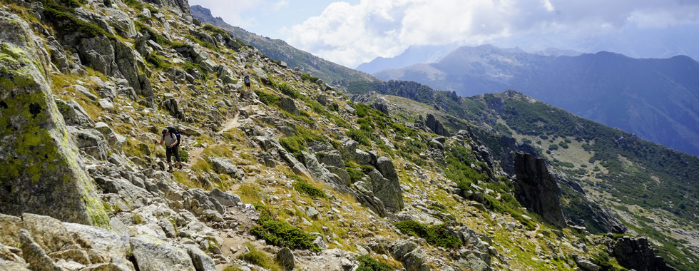 Vstáváme do chladného rána. I péřová bunda přijde vhod. Rychlá snídaně složená z míchaných ovesných vloček a čaje, zabalit věci, stan a zahřát se chůzí do kopce. Ideální ráno. Moje spálené břicho mi to trochu kazí naříkáním při zapínání bederáku krosny. Zatnout zuby, ono to za chvíli přestane bolet, jen si ten bágl nesmím sundat, jinak si to užiju znovu. Sluníčku chvíli trvá než začne hřát a pak se na celý den přidává i větřík udržující tak akorát teplotu na chůzi. Z L'Onda jdeme alternativou GR20 přes Punta all'Altore (2021 m) a sedlo Bocca Manganello (1800 m) do Bivouac de Petra Piana. Hřeben mezi bivaky má jen nějakých 7km, i přesto ho jdeme více než šest hodin. Po většinu času je vidět až na moře a cestička se místy stává spíše lezeckou, ale za mě rozhodně lepší, než jít po GR dole údolím. :) V Petra Piana budeme zůstávat na dvě noci, je to pěkné místo na hraně skály i když hodně větrné. Večer přichází mrak a prudce se ochlazuje, místnost na vaření je plná a tak nakonec volíme chvíli sezení mezi stany a pak urychleně teplý spacák.
